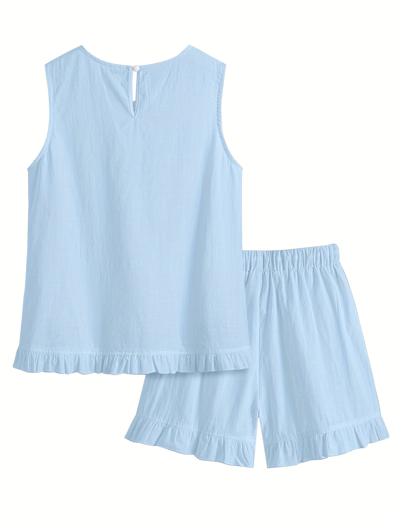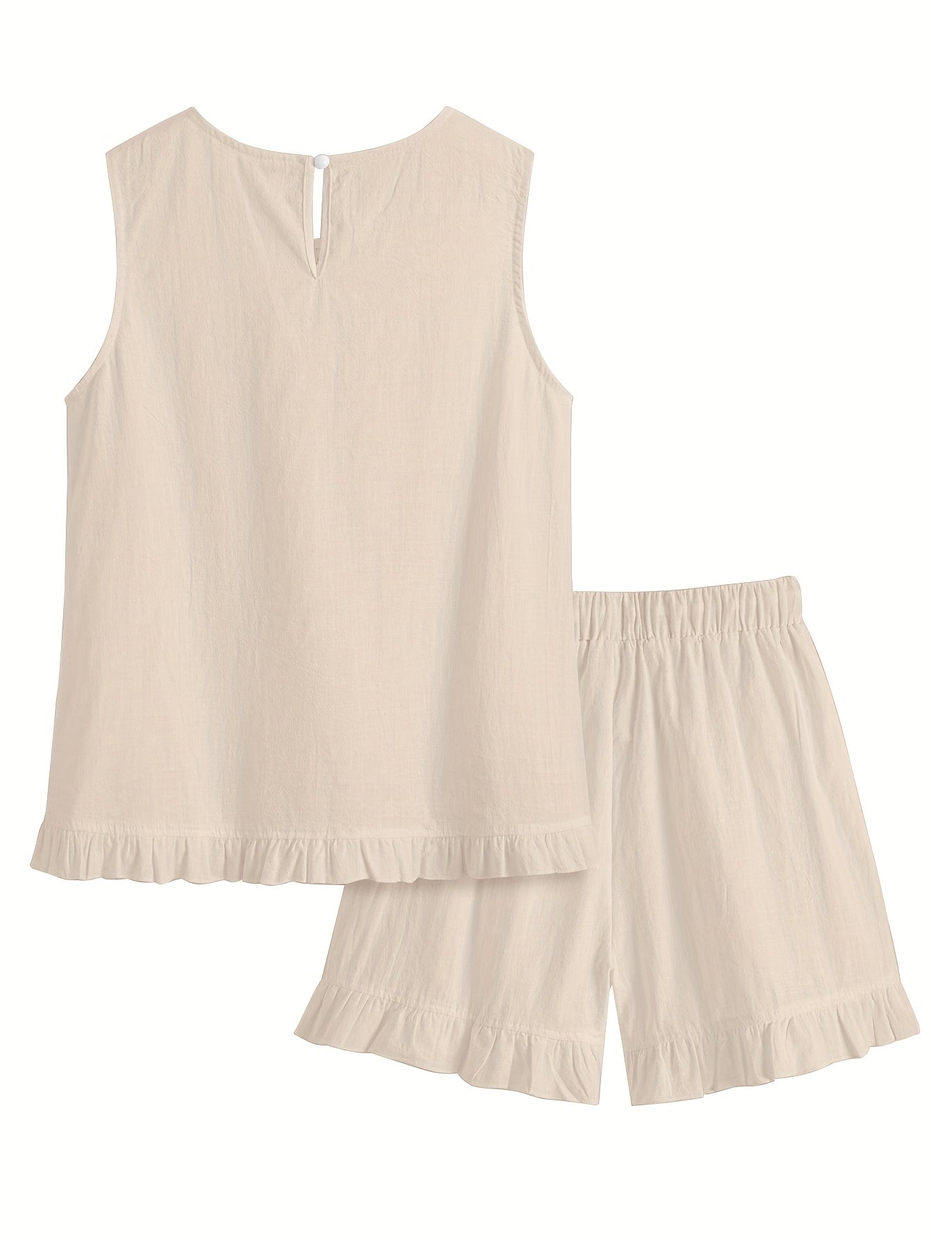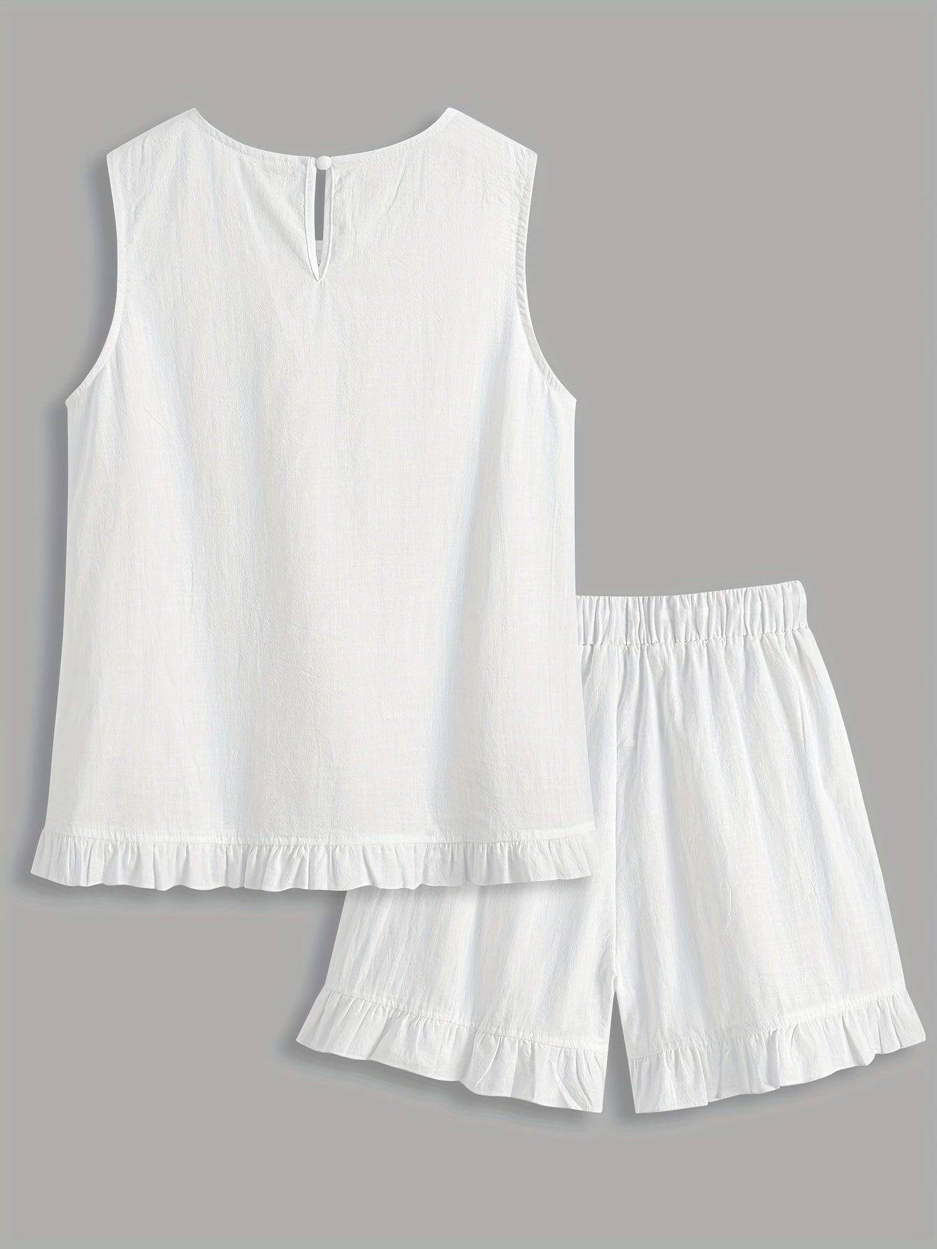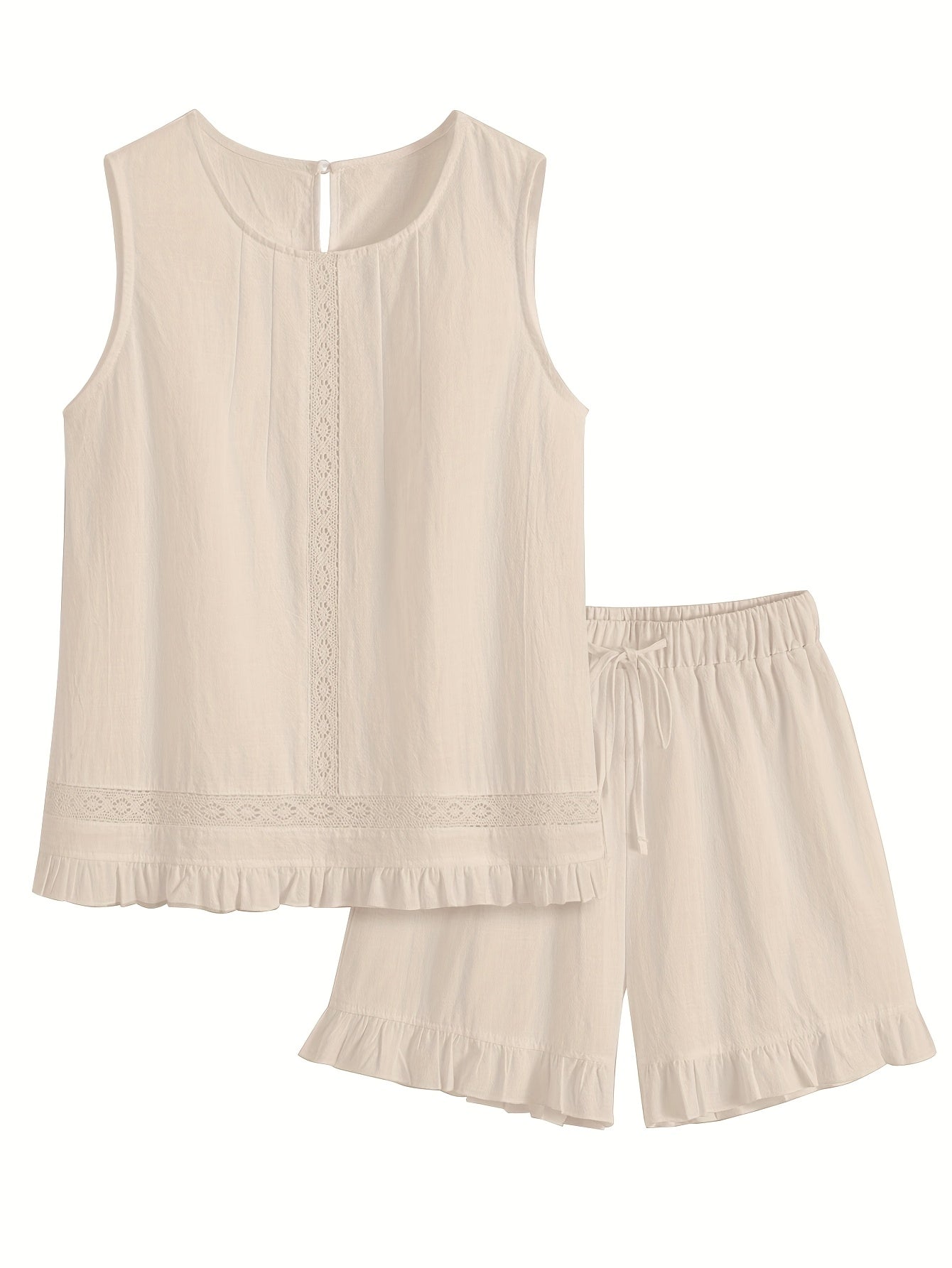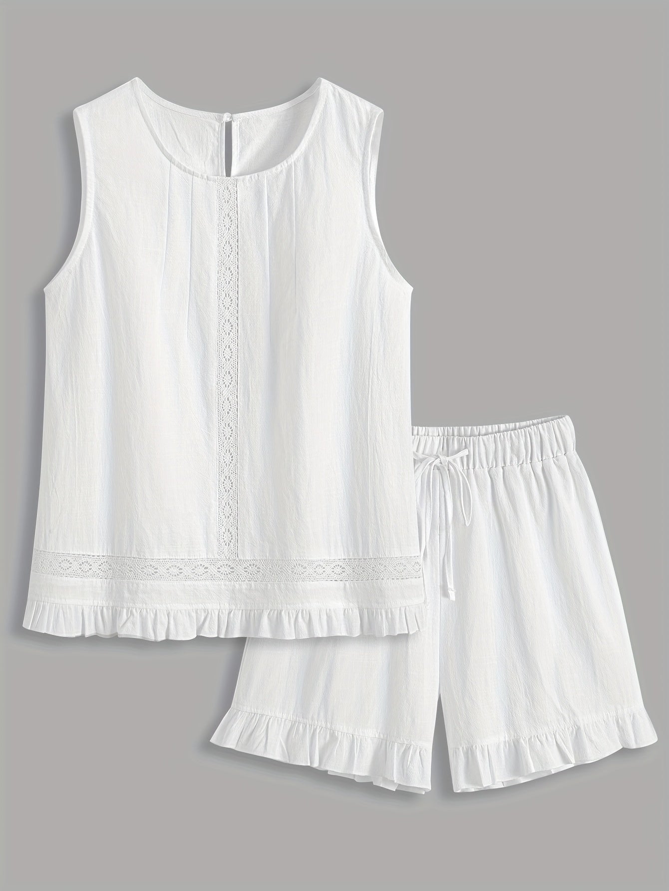 Luźny bawełniany komplet – bluzka z koronką bez rękawów i szorty z falbanką